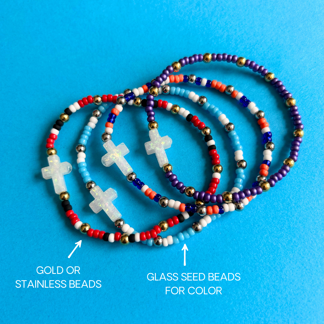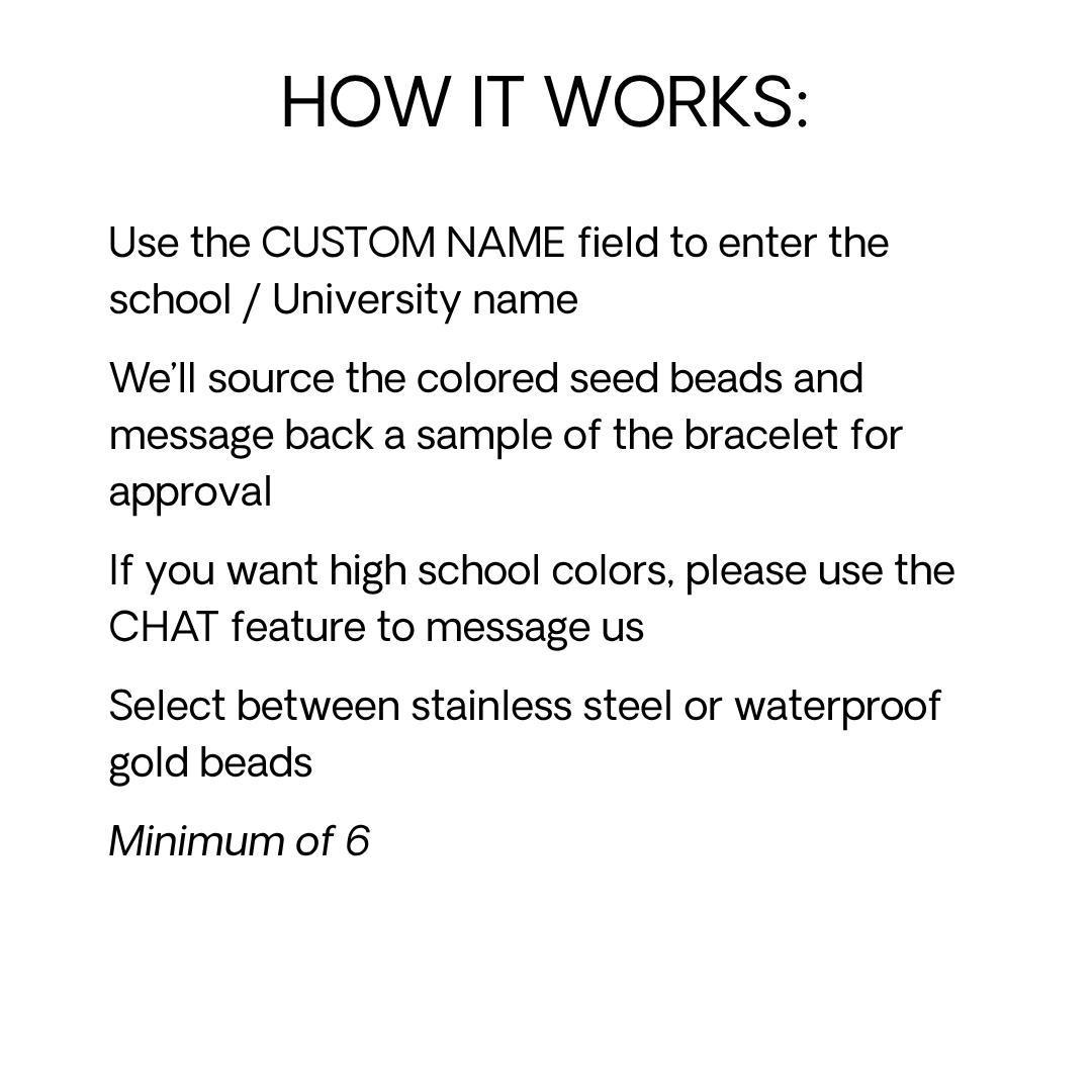 A wholesale only exclusive, this is a great opportunity to showcase your local school pride - whether it be a University or the local high school, we'll design a custom bracelet for your community. - To give us direction, please use the custom field to enter the school name (you can also email us more details at hello@holywaterbracelet.com OR use the chat feature on Faire) - We'll find the colors and beads to make something special - Choose between stainless steel and waterproof gold beads (we'll use these in between the colored seed beads) - Features our signature Cross infused with authentic water from Lourdes, France. - Available in regular as well as petite size options *Please note, these will have a generic UPC