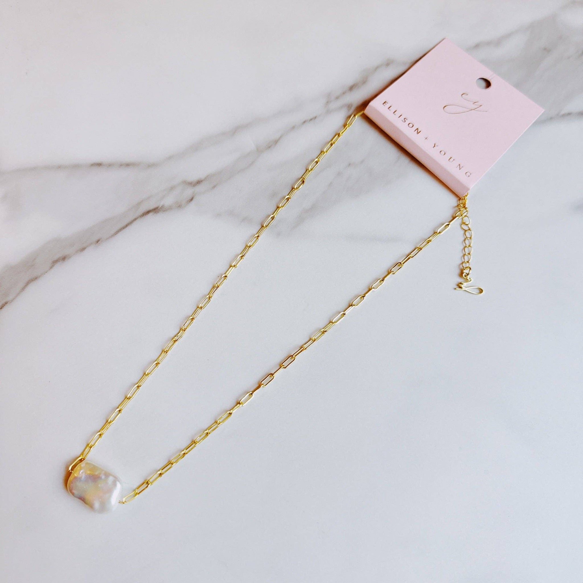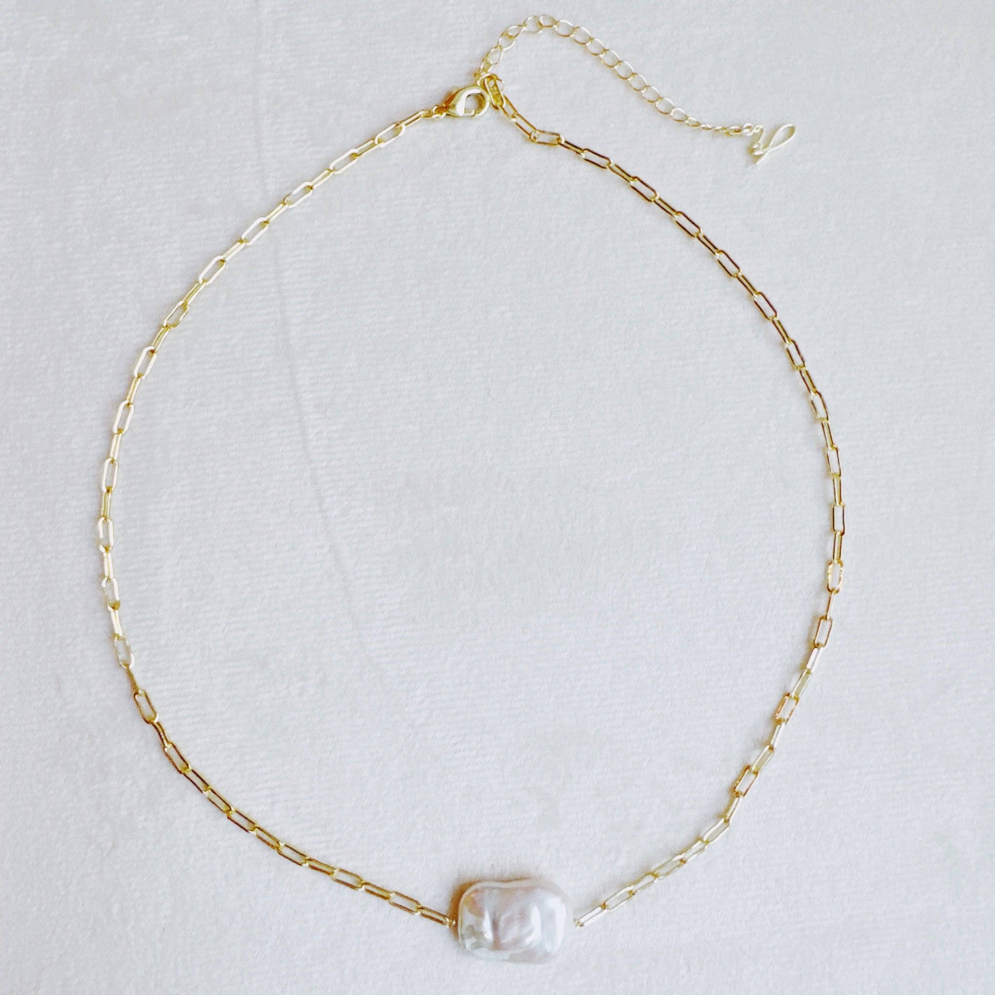 This Hannah Baroque Pearl Chain Necklace boasts a stunning and exclusive design featuring a baroque pearl and link chain. Enjoy the sophistication and elegance of this beautifully crafted piece. Stand out with this unique and timeless necklace.