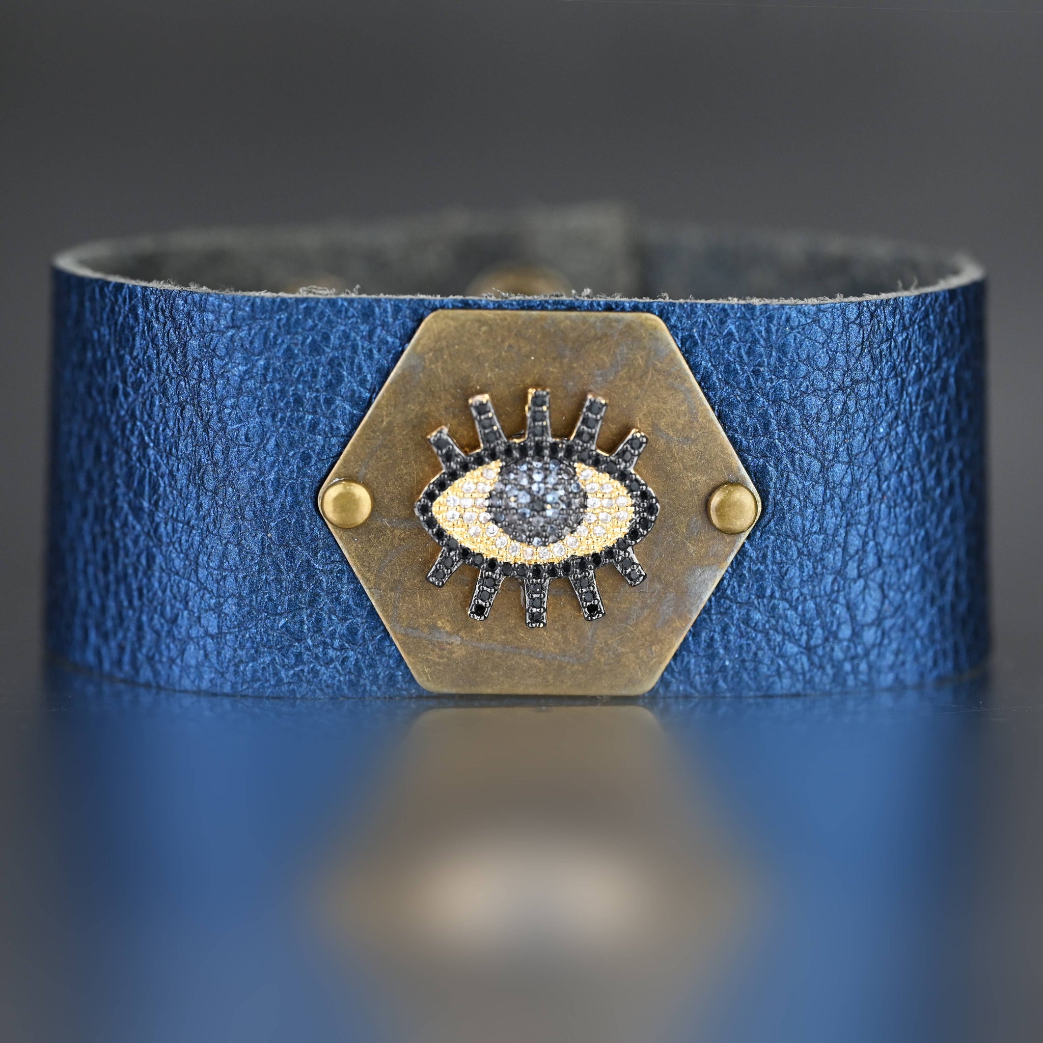 This is a great little midsize cuff featuring a beautiful pave eye on our stunning electric blue leather that will make any look a little more fun and daring.
