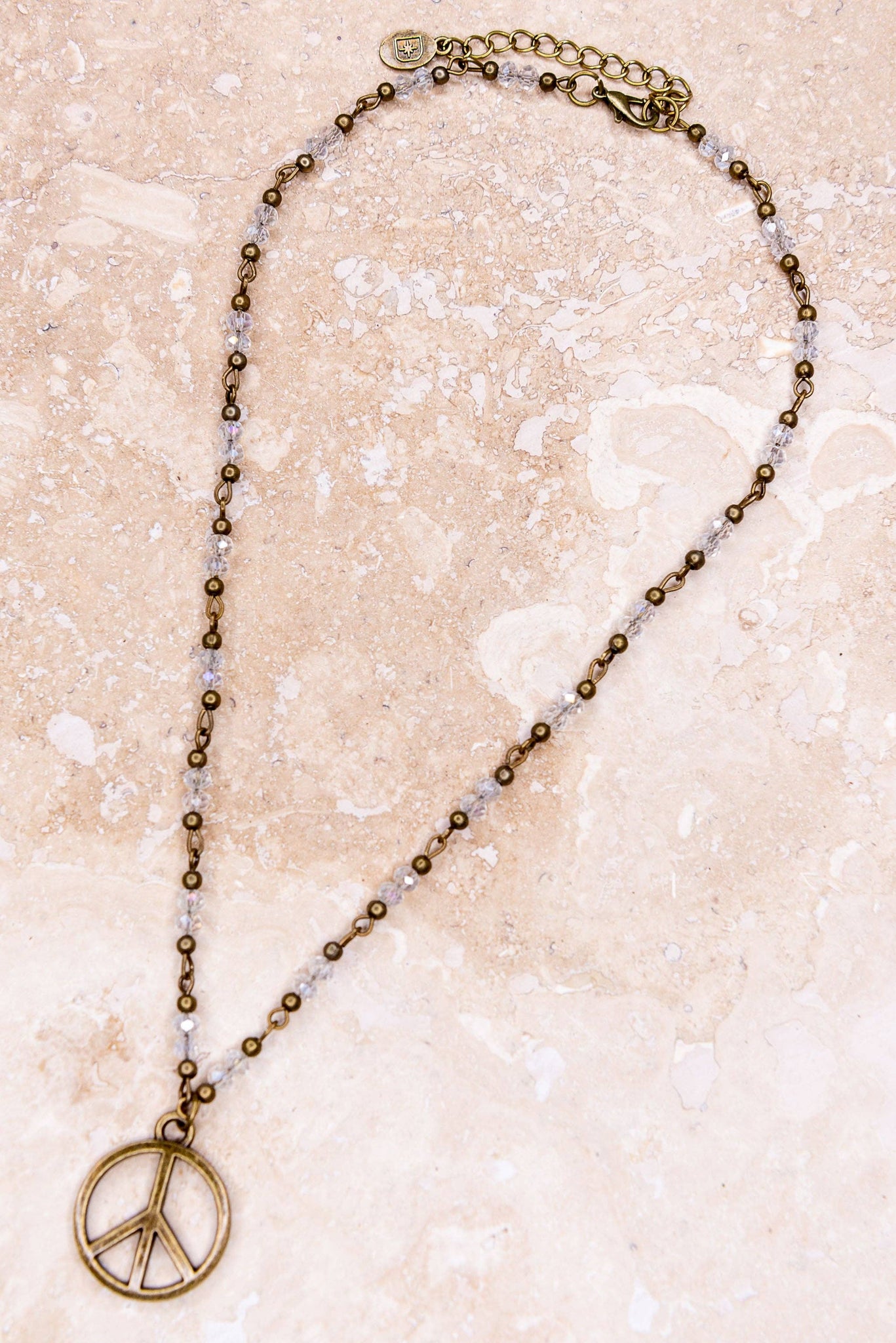 Adjustable, short beaded necklace with gold peace sign charm. Beads are clear and gold. All measurements done when necklace is closed on shortest link: 9" long, 1" peace charm Pairs well with the Peace Earrings!