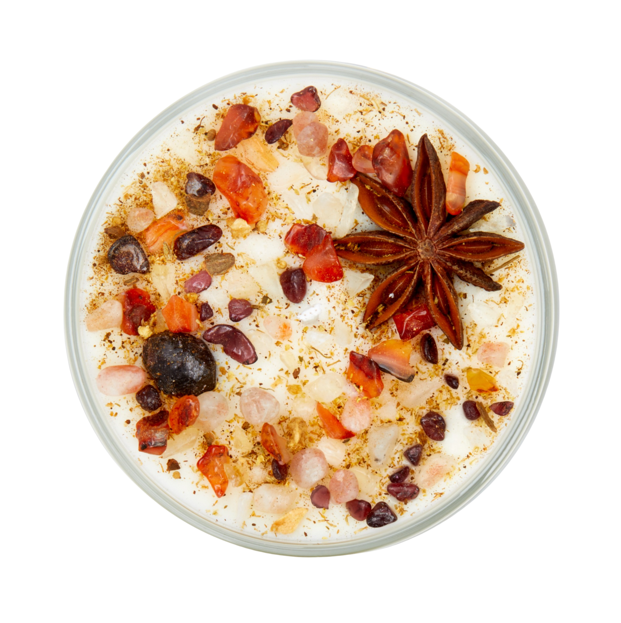 100% Eco-soy wax candle that is handmade and hand poured with a combination of Natural & Essential oils, lead-free cotton & paper wicks, natural crystals, dried flowers & herbs.
