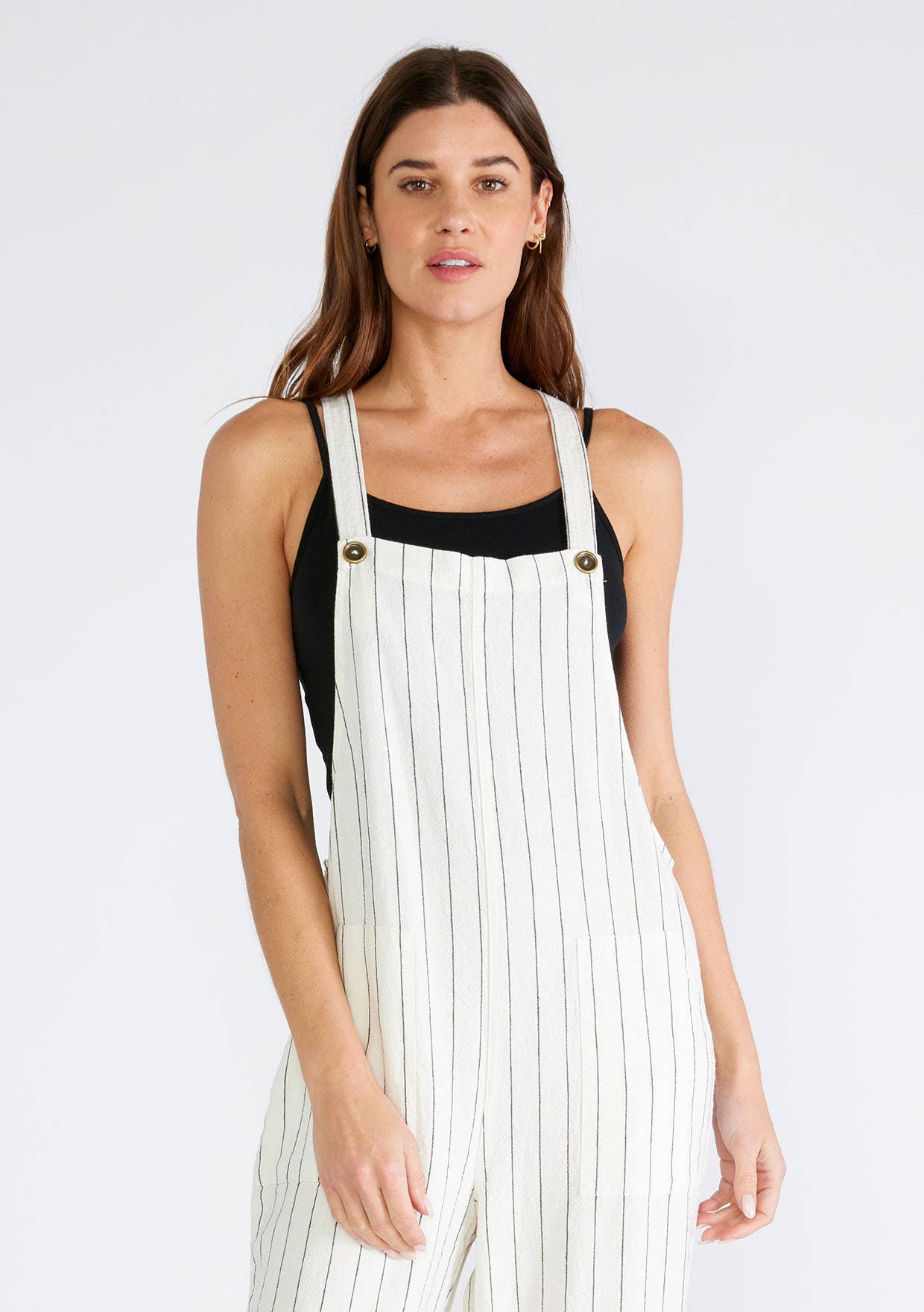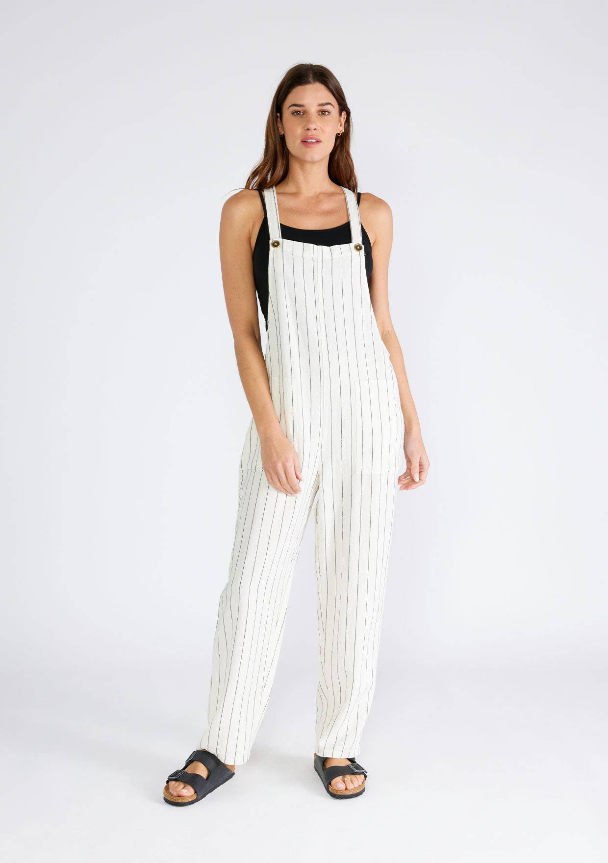 Linen blend overall in a yarn dye stripe. Features a straight leg, button strap, and side pockets. A versatile jumpsuit perfect for the Spring season.